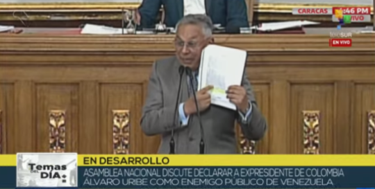 El diputado Pedro Carreño, fue el encargado de presentar el Proyecto de Acuerdo, quien informó acerca de los vínculos de Uribe con el narcotráfico, además de formar parte de un plan contra Venezuela.