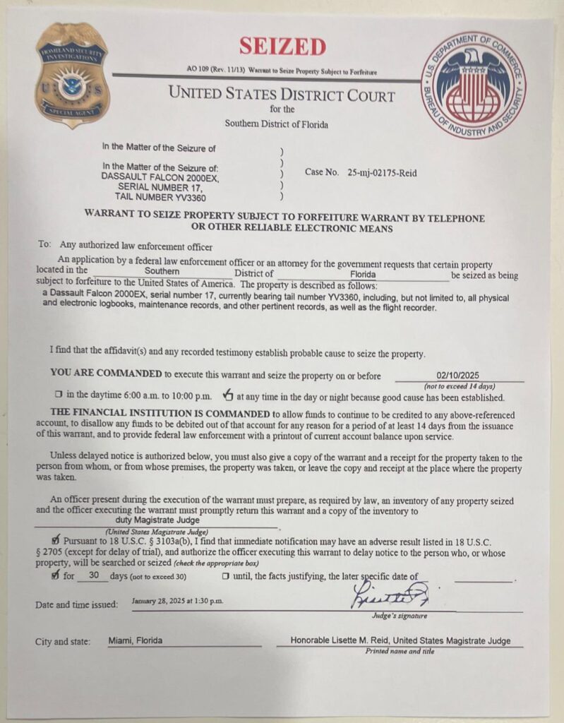La aeronave fue trasladada a una base aérea en Fort Lauderdale, en el estado de la Florida. Varias agencias federales estuvieron involucradas en la incautación de la aeronave identificada como T7-ESPRT, entre ellas, además del Departamento de Seguridad Nacional, el Departamento de Comercio, la Oficina de Industria y Seguridad y el Departamento de Justicia.