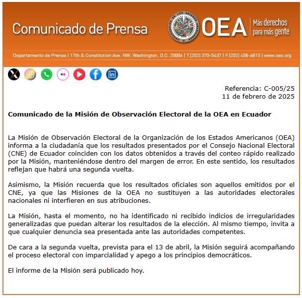 El lunes la candidata Luisa González también denunció «anomalías» en el escrutinio, expresó su desconfianza ante la autoridad electoral y aseguró que la fuerza pública impidió a algunos de sus observadores entrar a los recintos donde se hacía el conteo.