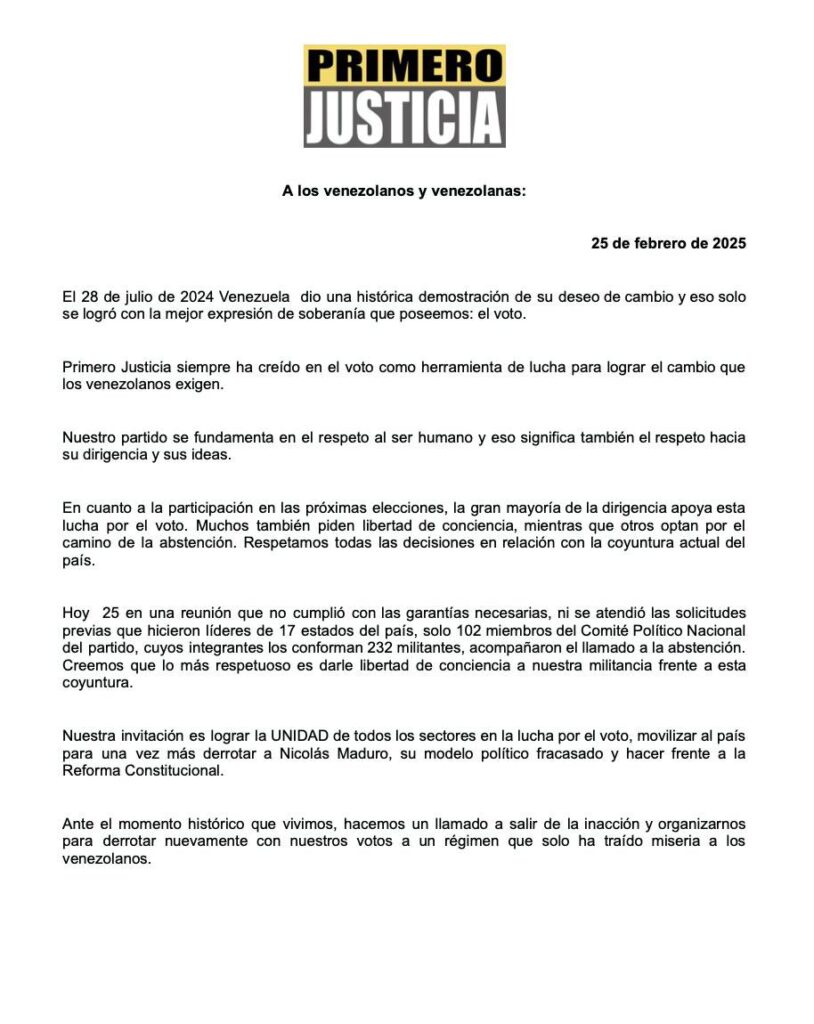 - Reiterar que las decisiones unitarias se adoptan en conjunto entre la Plataforma Unitaria Democrática, Edmundo González Urrutia y María Corina Machado. Y, en respaldo a la unidad y en protesta por la falta de condiciones democráticas, no participar del evento convocado por Nicolás Maduro para el 25 de mayo de 2025.