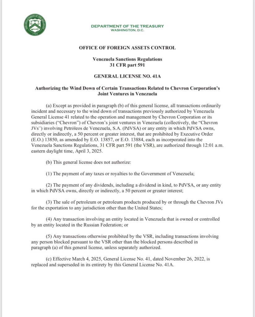 Y añade que «(a) Salvo lo dispuesto en el párrafo (b) de esta licencia general, todas las transacciones ordinariamente incidentales y necesarias para la liquidación de las transacciones previamente autorizadas por la Licencia General 41 de Venezuela relacionadas con la operación y administración por parte de Chevron Corporation o sus subsidiarias («Chevron»), de las empresas conjuntas de Chevron en Venezuela (colectivamente, las «JV de Chevron») en las que participa Petróleos de Venezuela, S.A. (PdVSA) o cualquier entidad en la que PdVSA posea, directa o indirectamente, una participación igual o superior al 50 por ciento, las cuales están prohibidas por la Orden Ejecutiva (O.E.) 13850, modificada por la O.E. 13857, o la O.E. 13884, cada una de ellas incorporada al Reglamento de Sanciones contra Venezuela, 31 CFR parte 591 (el VSR), están autorizadas hasta las 12:01 a.m. hora del este, el 3 de abril de 2025«.