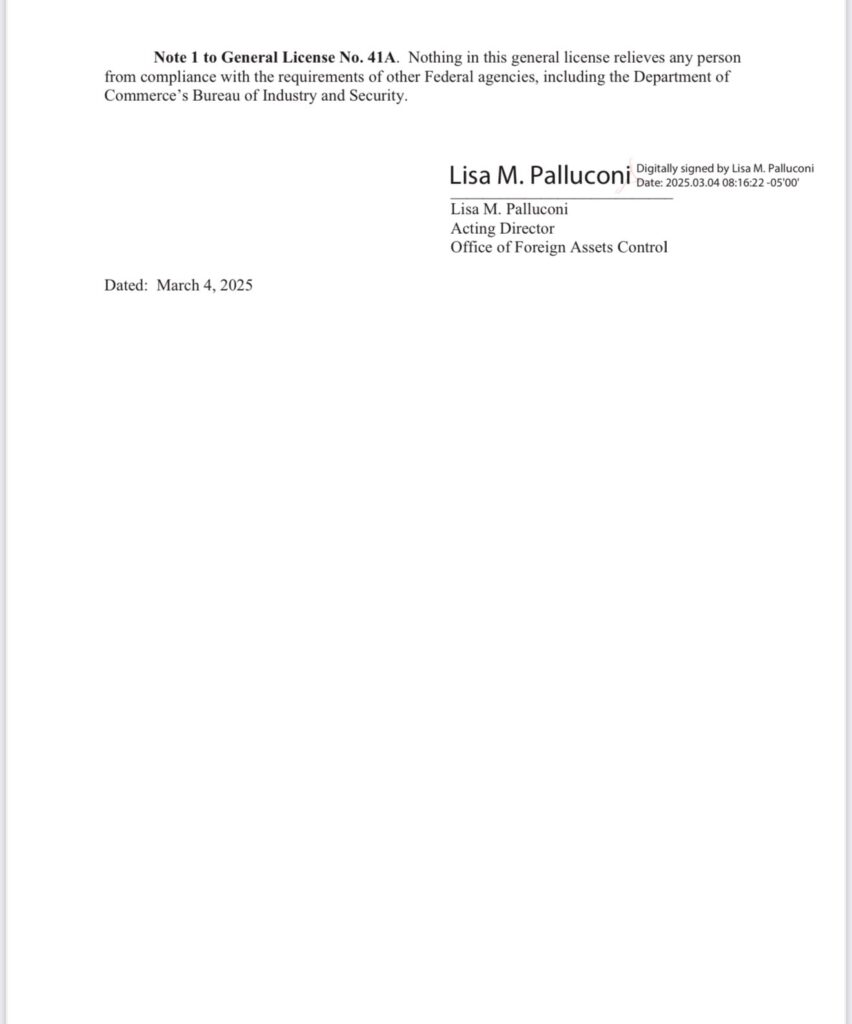 A partir del 4 de marzo de 2025, la Licencia General nº 41, de fecha 26 de noviembre de 2022, queda sustituida y reemplazada en su totalidad por la presente Licencia General nº 41A.