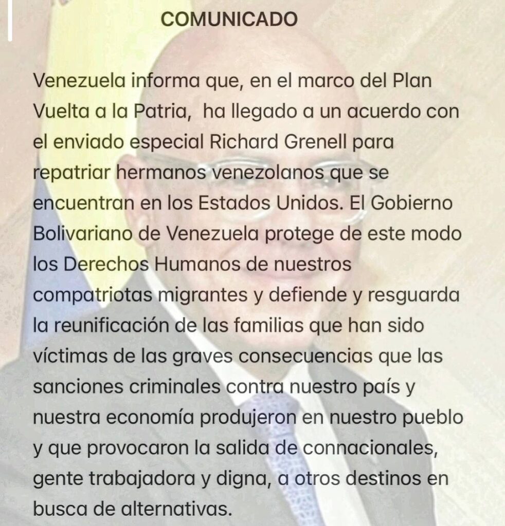 A través de un comunicado, Rodríguez confirmó que llegó a un acuerdo con el representante de EE.UU. Richard Grenell, para la reanudación de los vuelos, en el Plan Vuelta a la Patria, desde este 14 de marzo.