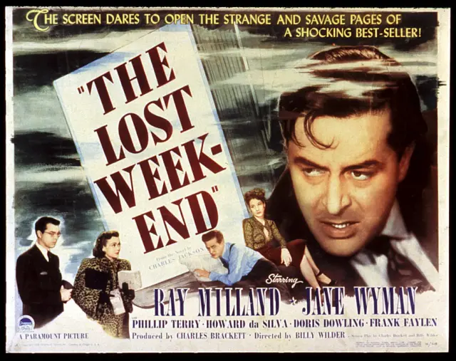 En 1945, Billy Wilder realizó el film The Lost Weekend (Días sin huella), que obtuvo varios Oscars, con Ray Milland en el rol de un escritor dominado por el alcohol. Esta vez no se trataba del viejo chiste del borrachín que debe operar en el hospital o el piloto que vemos acercarse tambaleante al avión sino la dura experiencia de un ser alcoholizado que nos descubre el número de tragos que comporta el estar alcoholizado: ¡un trago no basta y cien no son suficientes!