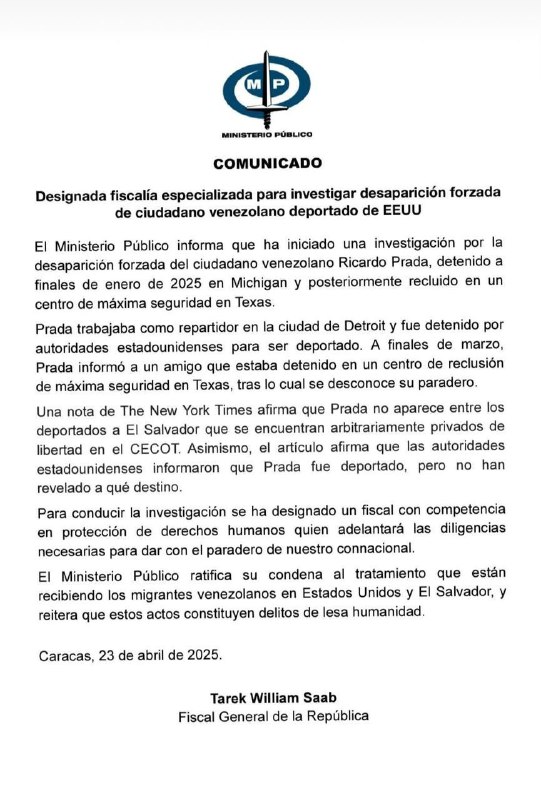 «A finales de marzo, Prada informó a un amigo que estaba detenido en un centro de reclusión de máxima seguridad en Texas, tras lo cual se desconoce su paradero», dijo el Ministerio Público en un comunicado.