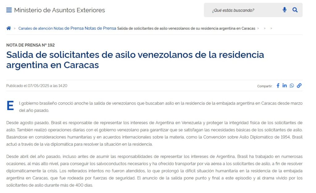 En una nota oficial, la cancillería citó que, como responsable de velar por los intereses argentinos en Caracas, Brasil «gestionó innumerables veces, al más alto nivel» los salvoconductos necesarios para que salieran de Venezuela y ofreció transportarlos «por vía aérea», pero aclaró que sus pedidos «no fueron atendidos».