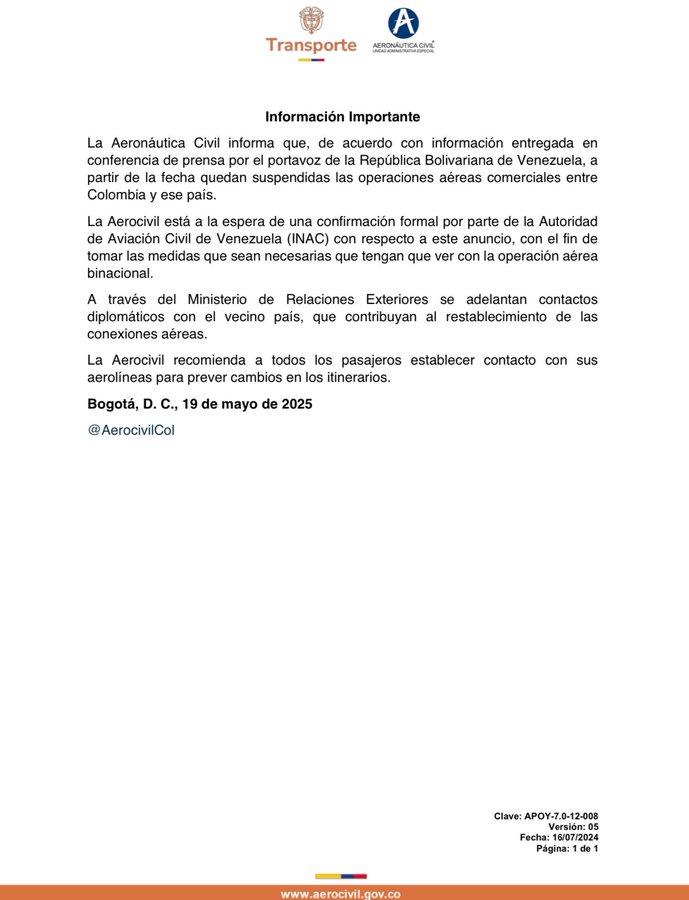 La Aeronáutica Civil (Aerocivil) de Colombia detalló en un comunicado que «está a la espera de una confirmación formal por parte de la Autoridad de Aviación Civil de Venezuela (INAC) con respecto a este anuncio, con el fin de tomar las medidas que sean necesarias que tengan que ver con la operación aérea binacional».