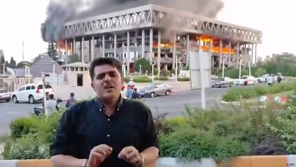 Imagen del edificio de la televisión pública iraní tras el ataque. Imagen: IRIB