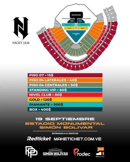 Por su parte, las entradas para ver a Nicky Jam en el Estadio Monumental Simón Bolívar pueden adquirirse a través de la página de Maketicket y Redticket con un costo a partir de los 15 dólares, la más económica, y 400 dólares, la más costosa.