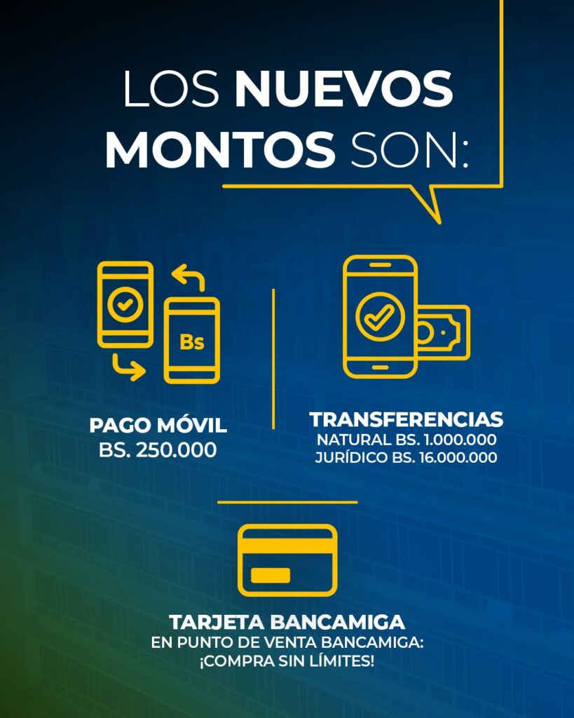 A partir de ahora, las transferencias suben hasta Bs. 16.000.000 para personas jurídicas y Bs. 1.000.000 para personas naturales. Los clientes Bancamiga podrán realizar operaciones sin límites al usar las tarjetas Bancamiga en los Puntos de Venta Bancamiga. Las operaciones por Pago Móvil aumentan hasta Bs. 250.000.