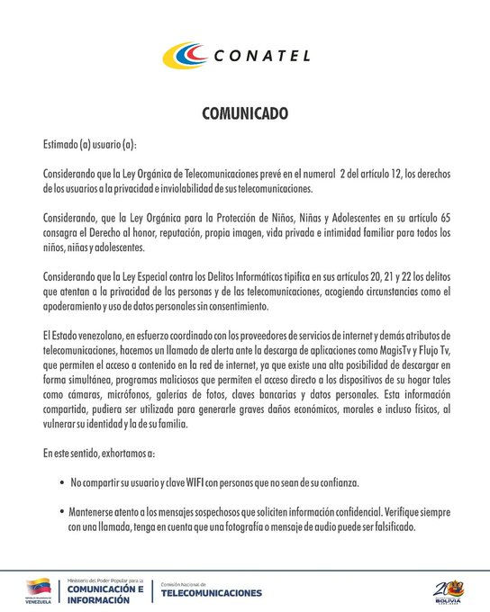 La Comisión Nacional de Telecomunicaciones (CONATEL), en ejercicio de sus atribuciones y en estricto cumplimiento del marco legal venezolano, emitió una alerta para prevenir a los usuarios sobre los graves riesgos asociados a la descarga y uso de aplicaciones no certificadas que ofrecen acceso a contenidos multimedia, tales como MagisTv y Flujo Tv.