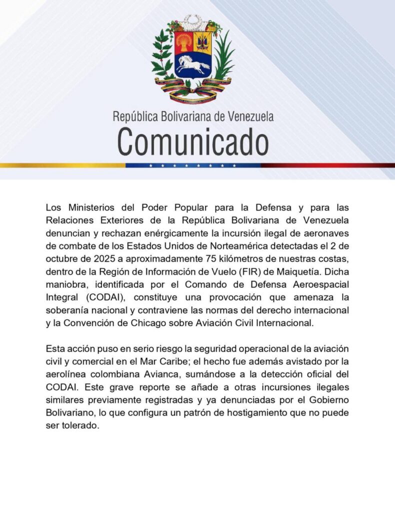 Ante la incursión ilegal de aeronaves de combate pertenecientes a los Estados Unidos (EE. UU.), detectadas a aproximadamente 75 kilómetros de las costas venezolanas, dentro de la Región de Información de Vuelo (FIR) de Maiquetía, los ministerios para la Defensa y para las Relaciones Exteriores de la República Bolivariana de Venezuela emitieron un comunicado conjunto en el que denuncian y rechazan enérgicamente esta acción, calificándola como una grave amenaza a la soberanía nacional.