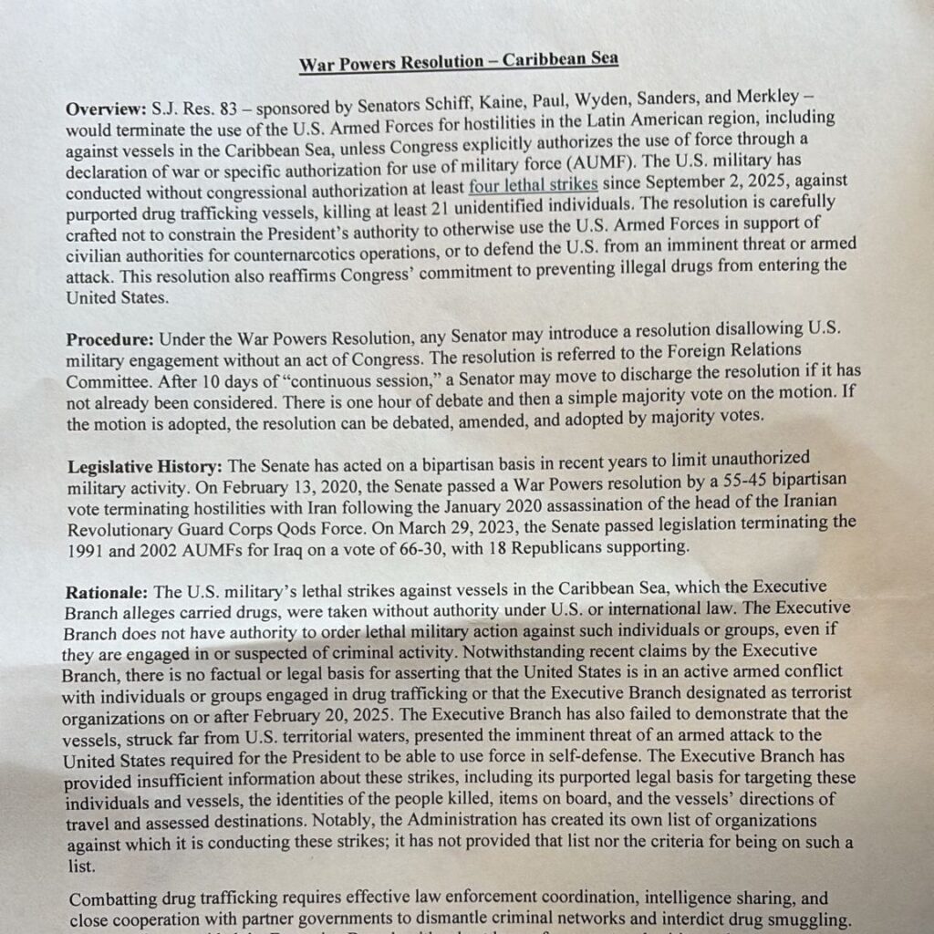 Varios senadores estadounidenses, encabezado por demócratas, presentaron la resolución 83) que tiene el objetivo de prohibir el uso de las Fuerzas Armadas en ataques relacionados con Venezuela sin la autorización explícita del Congreso.