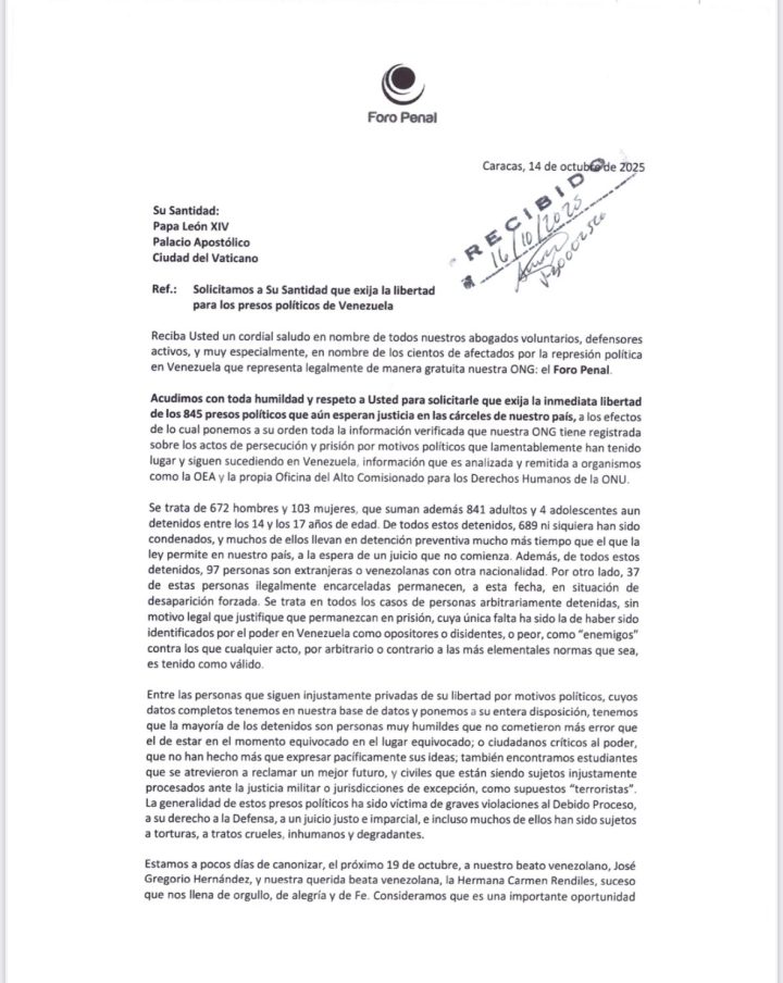En un gesto profundamente humano y esperanzador, Foro Penal, organización venezolana reconocida internacionalmente por su defensa de los derechos humanos, envió una carta a Su Santidad el Papa León XIV, a través del Nuncio Apostólico en Venezuela, Monseñor Alberto Ortega Martín, solicitando su intervención para promover la liberación de los presos políticos en el país.