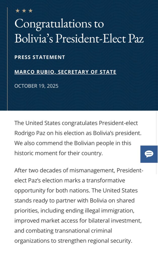 “Estados Unidos felicita al presidente electo Rodrigo Paz por su elección como presidente de Bolivia. También felicitamos al pueblo boliviano en este momento histórico para su país”, apuntó el jefe de la diplomacia estadounidense.