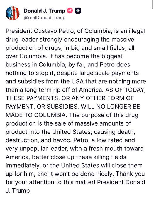 Horas antes, Trump había suspendido «pagos» y cualquier forma de «subvenciones» a Colombia tras acusar al gobierno de Petro de tolerar la producción de drogas y afirmar que el mandatario es un «líder narcotraficante».