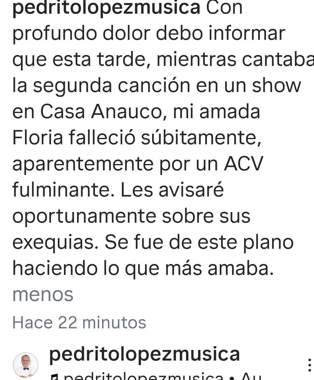 Su esposo, Pedro López, confirmó la información en un mensaje publicado en redes sociales, en el que señaló que la artista habría sufrido un ACV fulminante mientras interpretaba la segunda canción de su presentación.