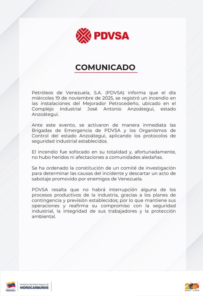 Petróleos de Venezuela, S.A. (PDVSA) informó que el pasado miércoles 19 de noviembre, se produjo un incendio en las instalaciones del Mejorador Petrocedeño, ubicado en el Complejo Industrial José Antonio Anzoátegui.