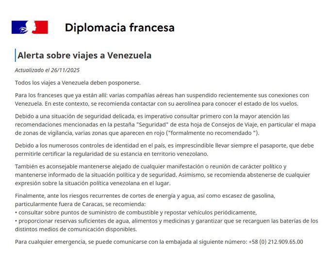 El ministerio de Relaciones Exteriores de Francia actualiza hoy su página de recomendaciones a los franceses que deseen viajar a Venezuela o ya se encuentren en el país: