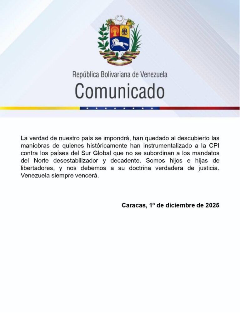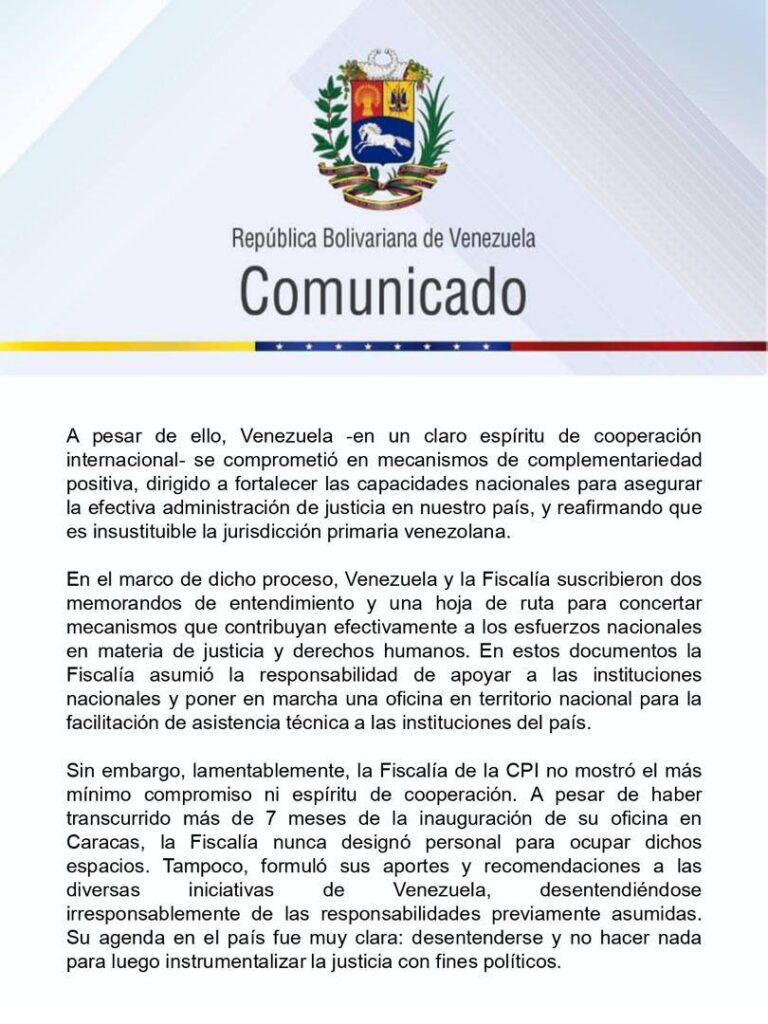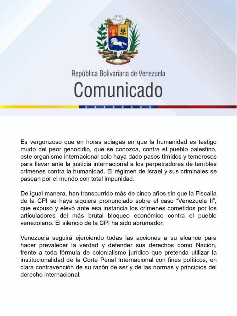 En el comunicado, el ministro de Relaciones Exteriores, Yván Gil, recuerda que Venezuela ha sido uno de los países más comprometidos con el Estatuto de Roma y sostiene que el proceso en su contra no encaja en los supuestos de crímenes de lesa humanidad impulsado por una «agenda anti Venezuela desde centros hegemónicos».