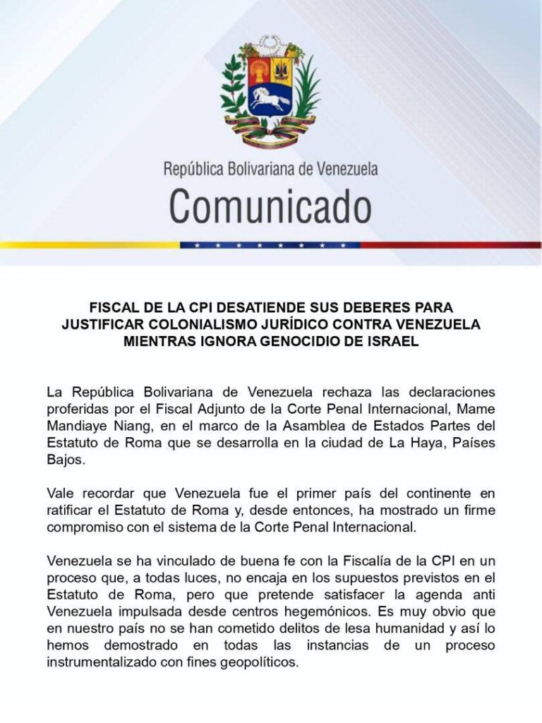 Mediante un comunicado, el gobierno de Nicolás Maduro rechazó las declaraciones del fiscal adjunto de la Corte Penal Internacional (CPI), Mame Mandiaye Niang, este lunes durante la Asamblea de Estados en La Haya.