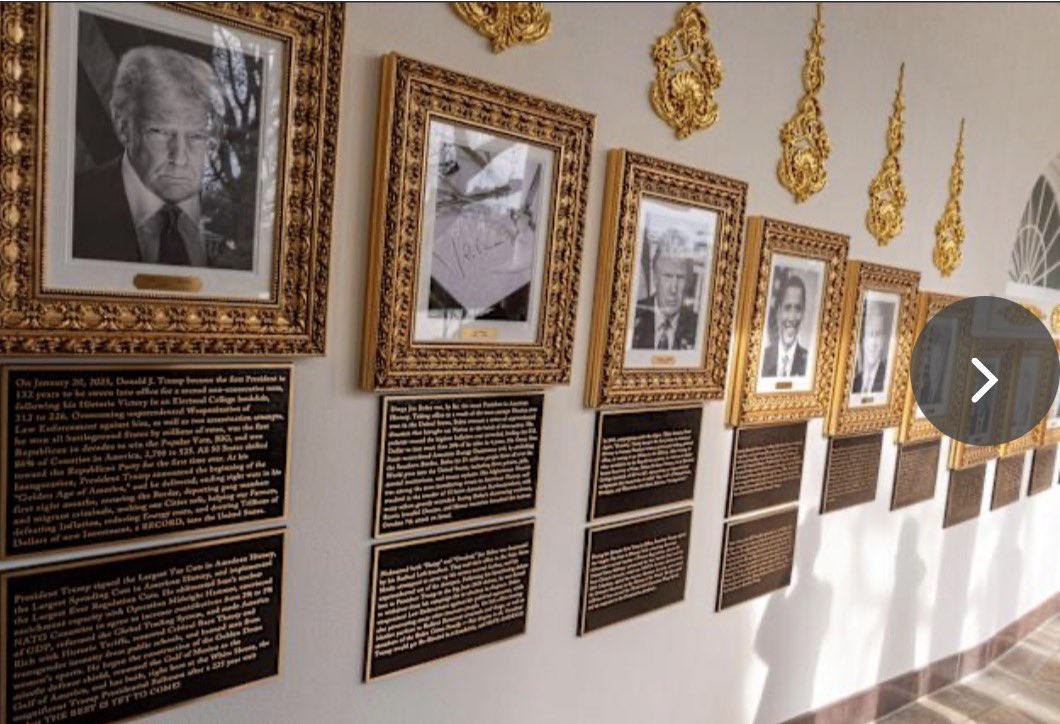 La propia placa de Trump presume su victoria en 2024, afirmando que superó “sin precedentes la instrumentalización de las fuerzas del orden en su contra, así como dos intentos de asesinato”. Y declara que Trump, quien lleva 11 meses en el cargo, ha “cumplido” su promesa del día de la Investidura de inaugurar la “época dorada de Estados Unidos”, señalando sus afirmaciones de que se han acabado las guerras, se han asegurado las fronteras y se ha deportado a los presuntos miembros de pandillas.
