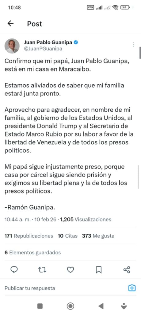 «Confirmo que mi papá, Juan Pablo Guanipa, está en mi casa en Maracaibo. Estamos aliviados de saber que mi familia estará junta pronto».