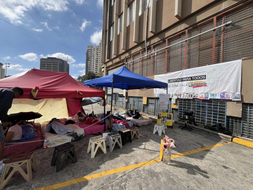 La mañana de este miércoles, familiares continúan la huelga de hambre en las inmediaciones de la sede de la Policía Nacional Bolivariana en Boleíta, Zona 7, exigiendo respuestas del Estado.