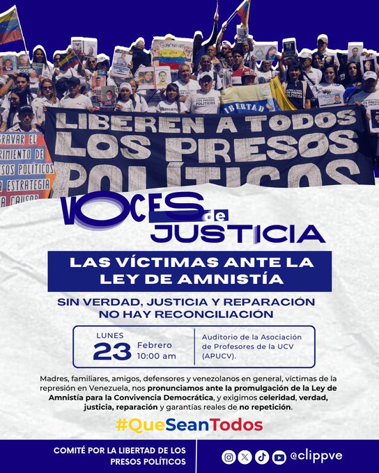 «La Ley de Amnistía generó expectativas en muchas víctimas que hoy se sienten desamparadas y engañadas, mientras continúan apostadas las 24 horas del día frente a las cárceles desde el pasado 8 de enero, acumulando más de 40 días, con la esperanza firme de libertad y a la espera del cumplimiento de las promesas públicas de liberación», señala el Clippve.