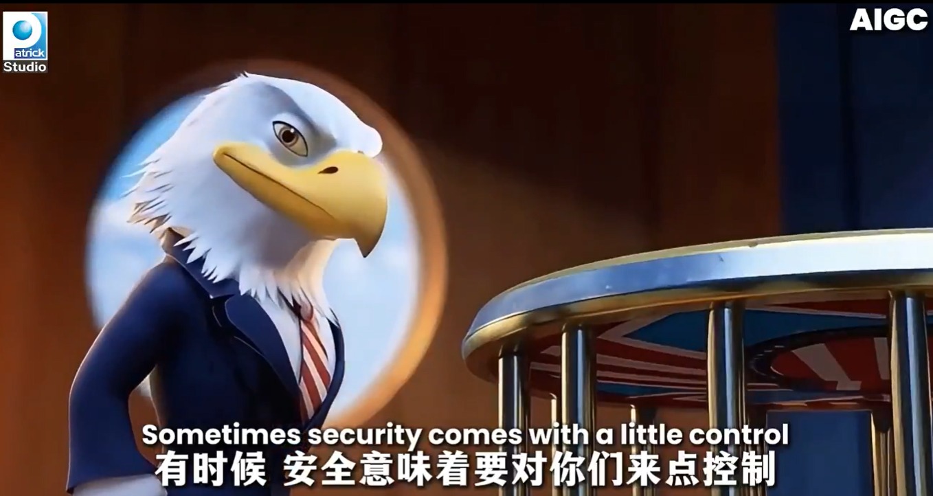 El águila promete “mantener a todos seguros” y presiona un botón rojo que inicialmente despliega un escudo protector. Sin embargo, el escudo pronto se transforma en grilletes que encierran a las aves, mientras el personaje afirma: “Relájense, a veces la seguridad viene con un poco de control”.