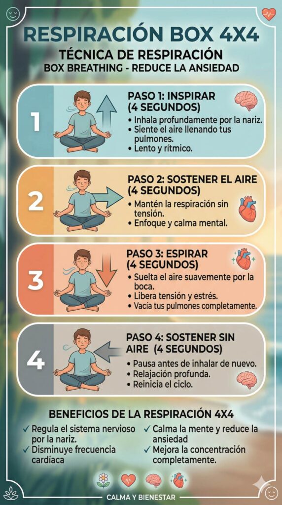 El box breathing es el puente fisiológico que desactiva la alarma de la amígdala y devuelve el control al área lógica del cerebro, permitiéndole pensar con claridad cuando más lo necesita.