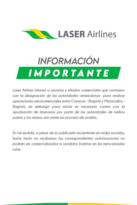 El vicepresidente de la aerolínea Laser, René Cortés, aclaró que, a pesar de que ha sido seleccionada para realizar los vuelos entre Bogotá y caracas aún no han recibido esas autorizaciones, por lo que la venta de boletos todavía no se ha concretado.