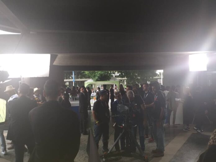 Una gran alfombra de color azul daba la bienvenida a los medios de comunicación que se apostarían a las puertas del Aula Magna de la UCV.