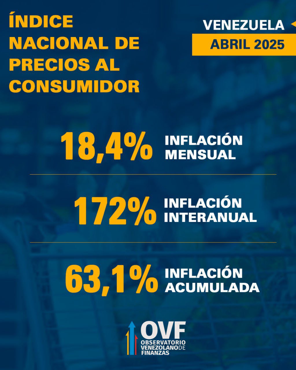 La inflación en Venezuela, según información del Observatorio Venezolano de Finanzas, para el mes de abril de 2025 se ubicó en 18,4% mensual, 172% interanual y 63,1% acumulada. Este aumento … Leer más