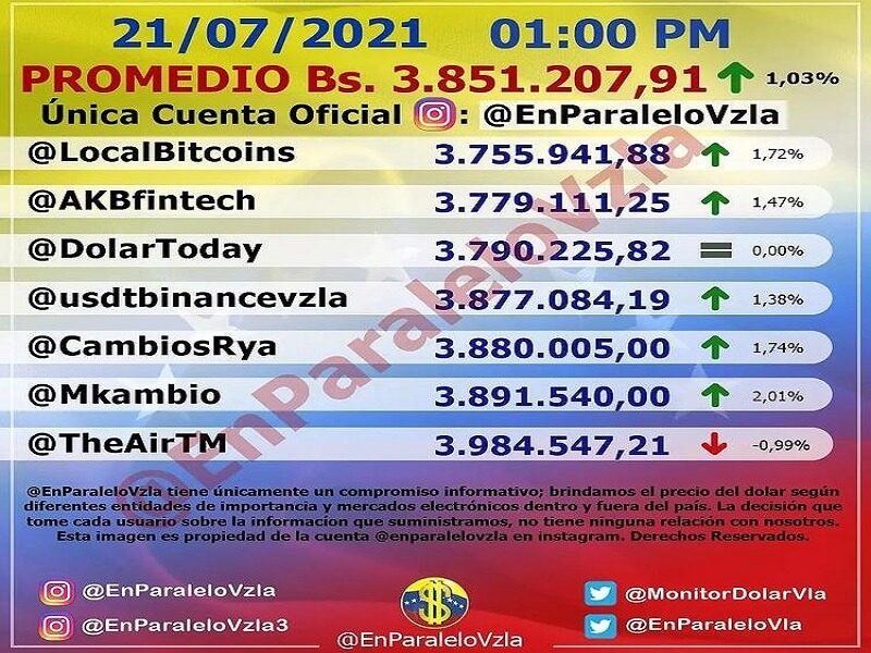 El dólar paralelo siguió avanzando este miércoles, pese a los intentos del Banco Central de Venezuela y en esta jornada se ubicó en Bs. 3.851.207,91.