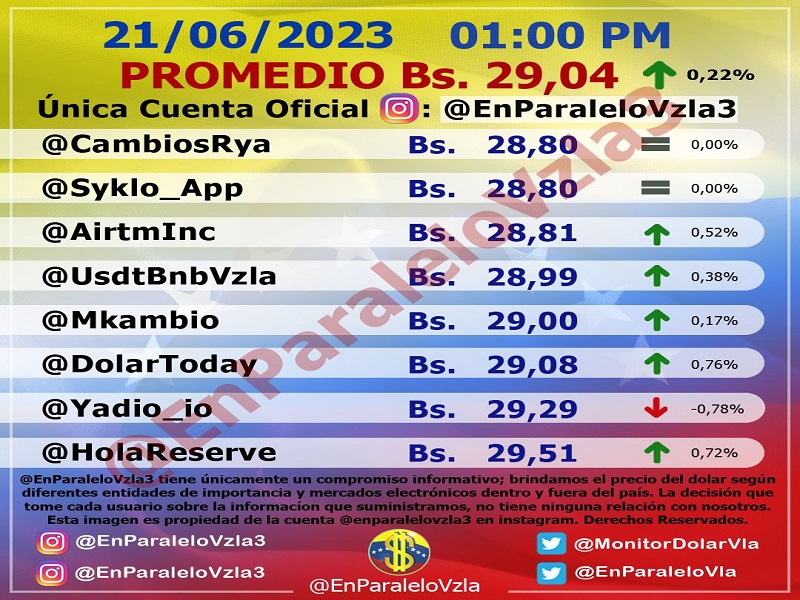 Este miércoles, el dólar paralelo sobrepasó la barrera de los 29 bolívares, para ubicarse en Bs. 29,04, con lo cual mantiene la tendencia al alza que veía presentando en los últimos días.