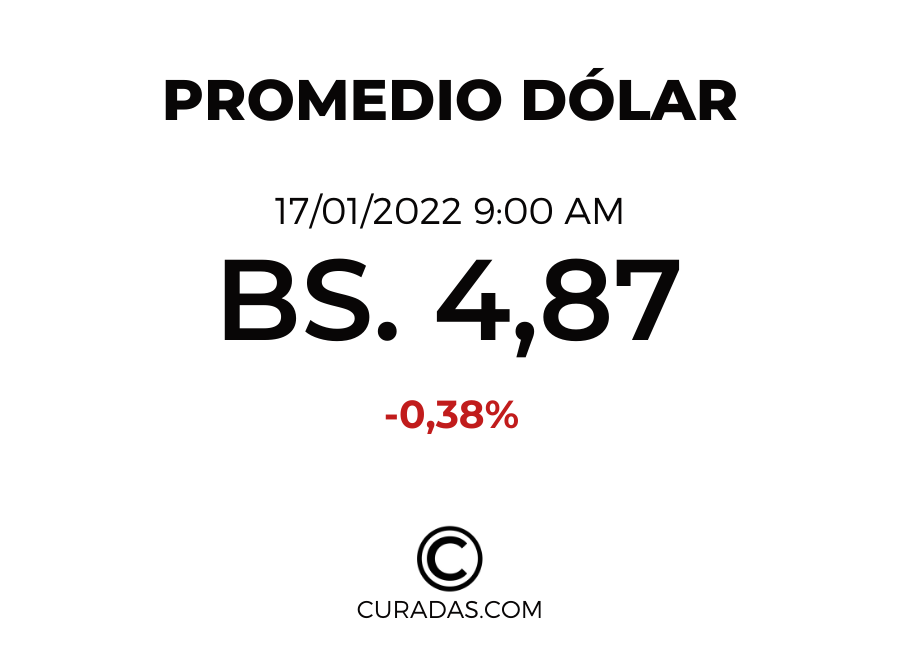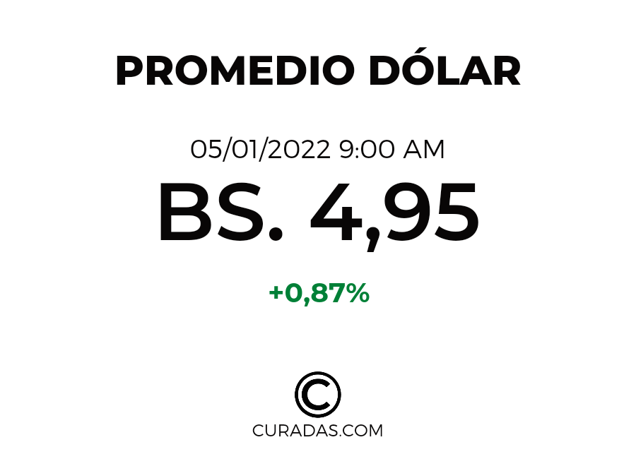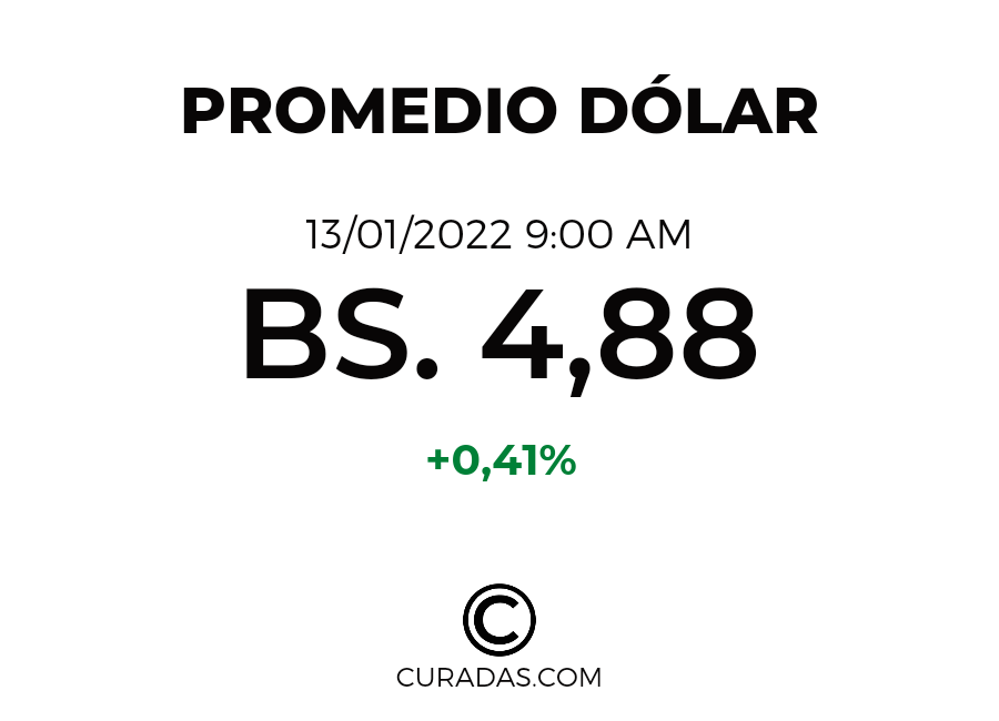 Dólar Promedio: Bs. 4,87 | Dólar BCV: 4,64 | Euro BCV: Bs. 5,65 | Bitcoin: US$ 41,868.20