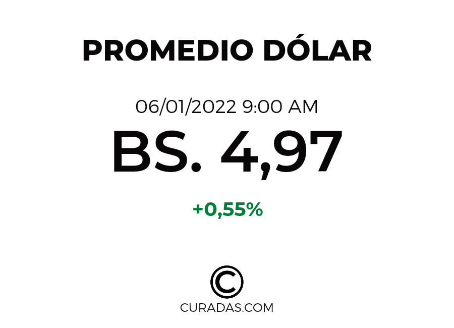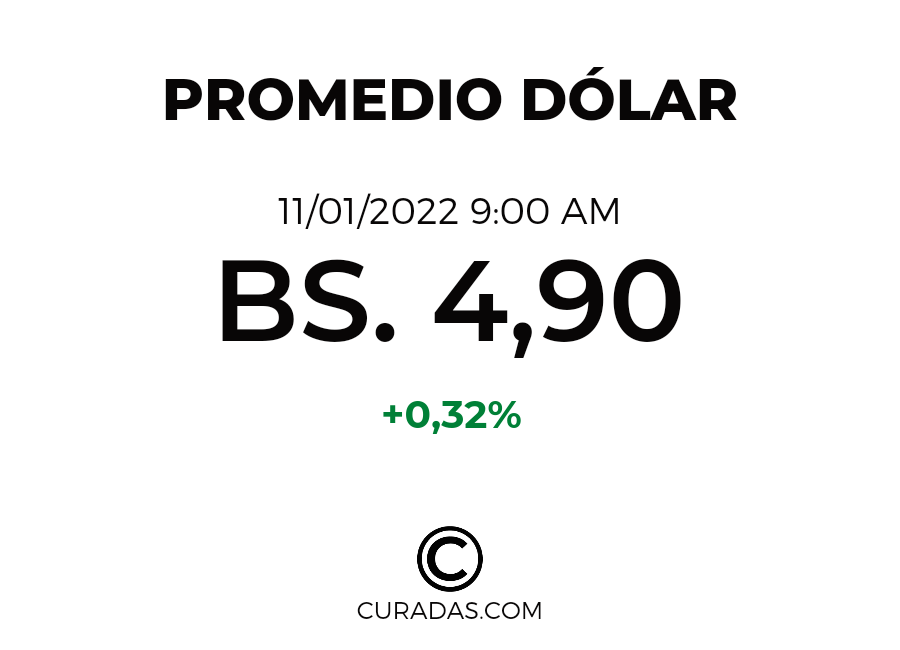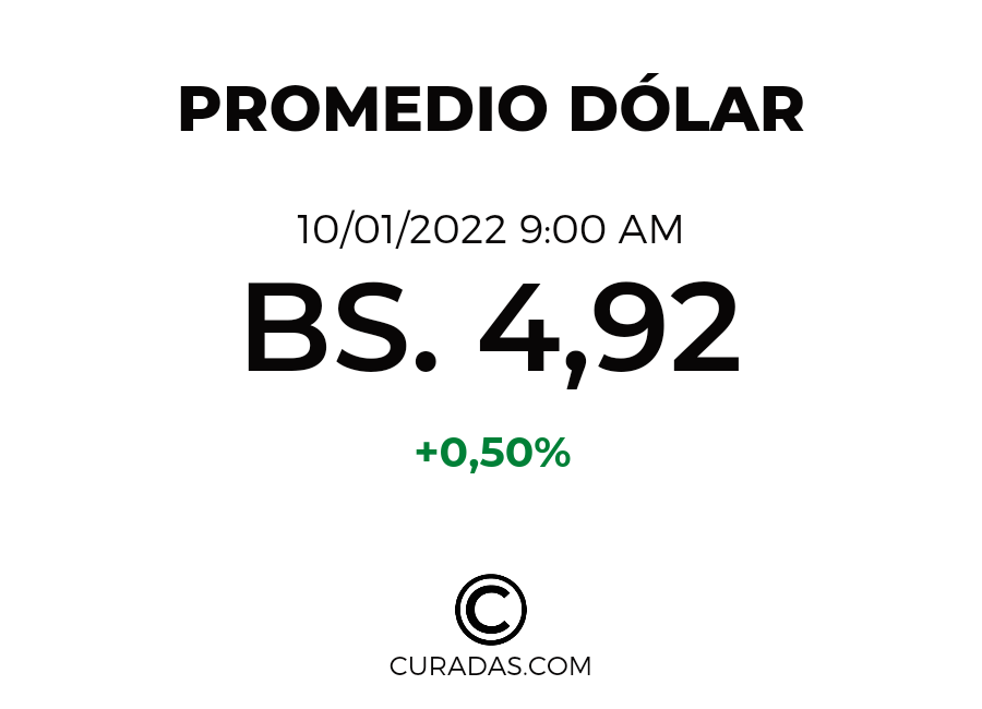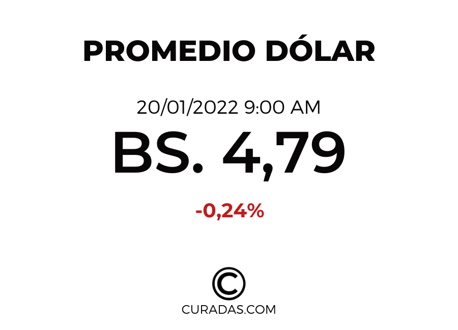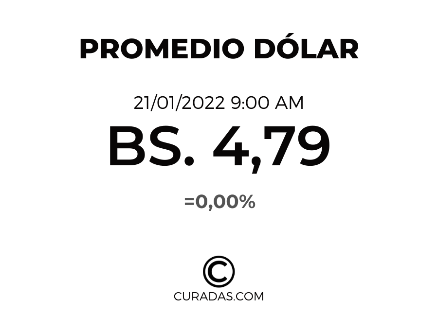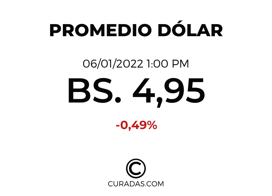 Dólar Promedio: Bs. 4,76 | Dólar BCV: 4,60 | Euro BCV: Bs. 5,52 | Bitcoin: US$ 47.149,80