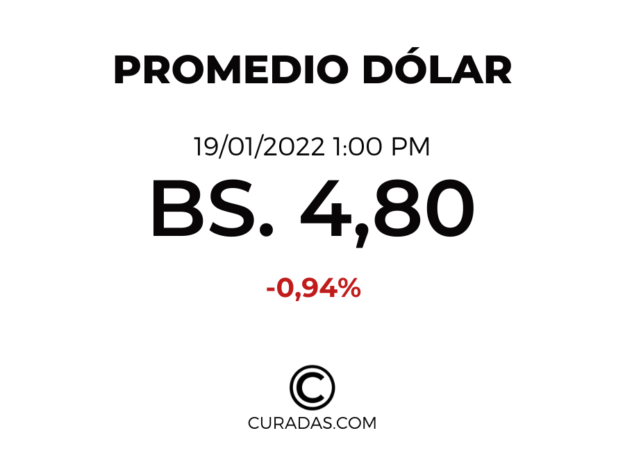 Dólar Promedio: Bs. 4,81 | Dólar BCV: 4,60 | Euro BCV: Bs. 5,52 | Bitcoin: US$ 47.149,80